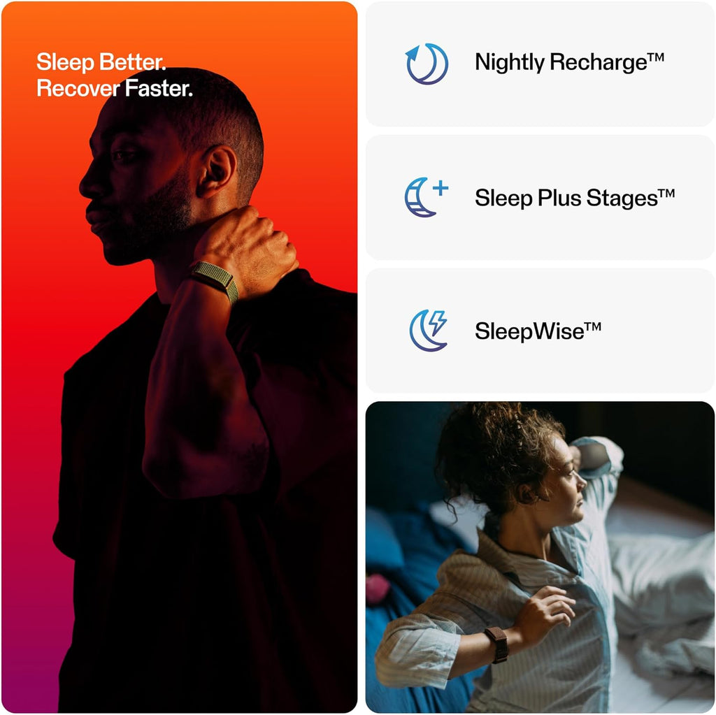 Con solo 29 gramos, es la banda más ligera y discreta. Sin pantallas brillantes que te distraigan. Pura comodidad 24/7.