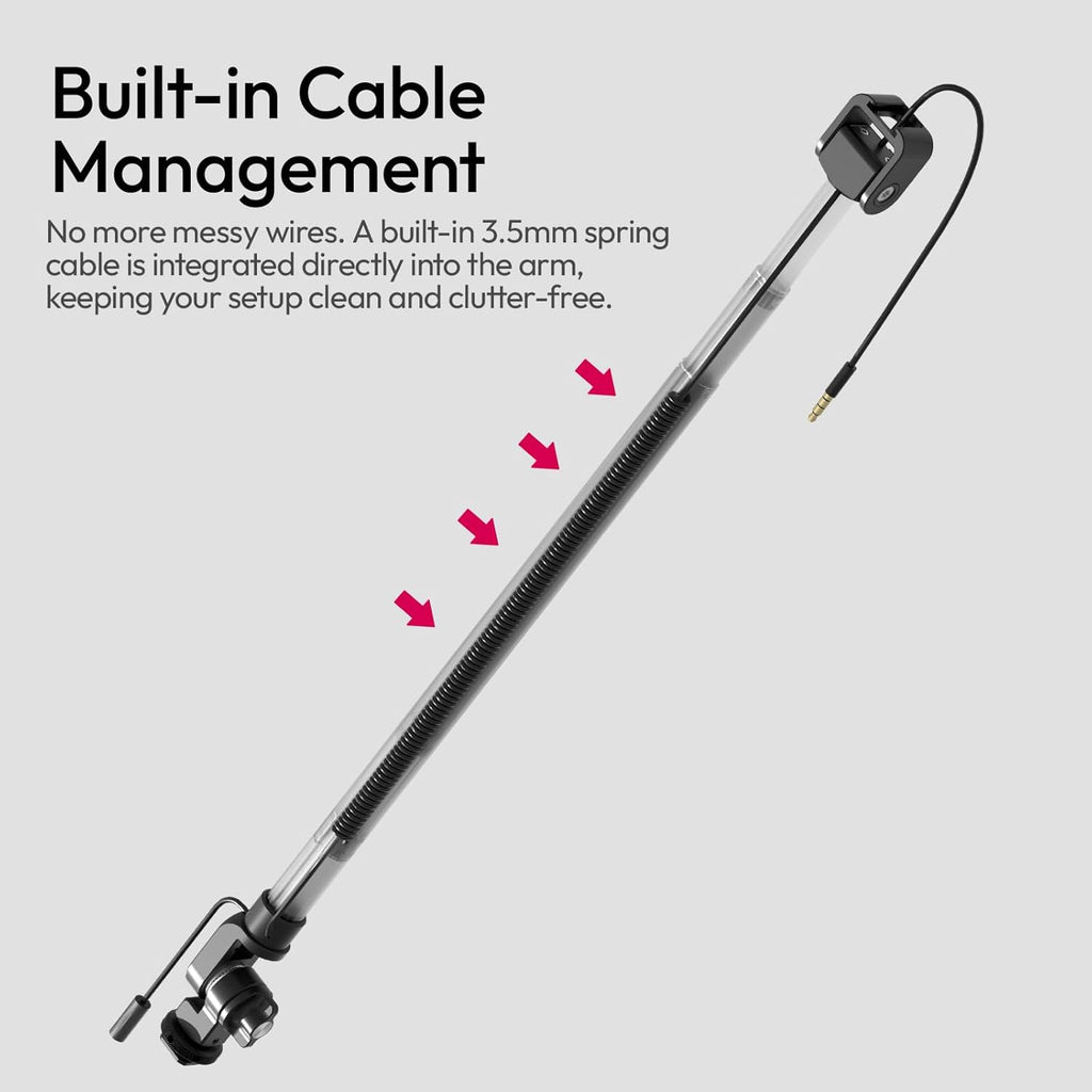 Acerca el micrófono. Esconde el cable. Extensión de 1 metro y gestión de cables integrada para un setup impecable.