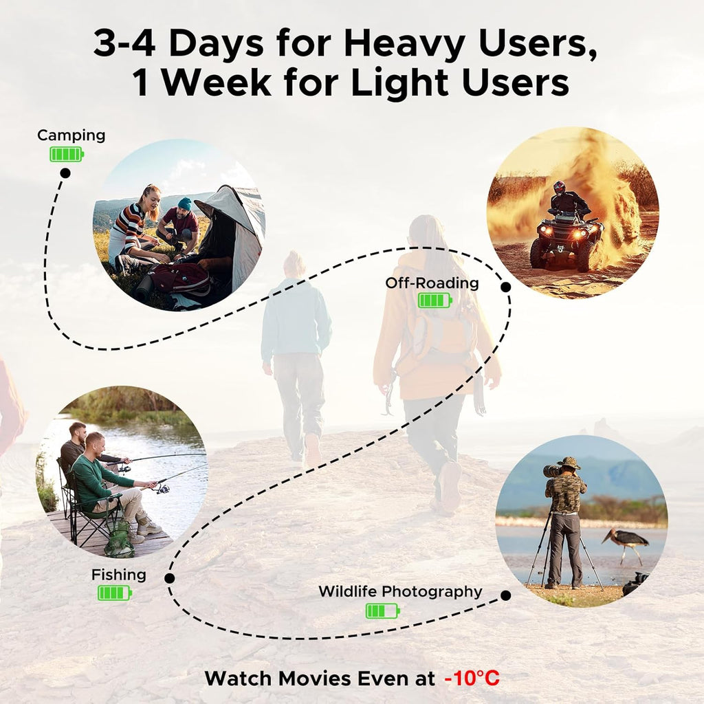 Olvídate del cargador hasta por una semana. Con 1540 horas en espera, es ideal para expediciones largas. Además, funciona como Power Bank (Carga Inversa) para cargar los dispositivos de tus compañeros.