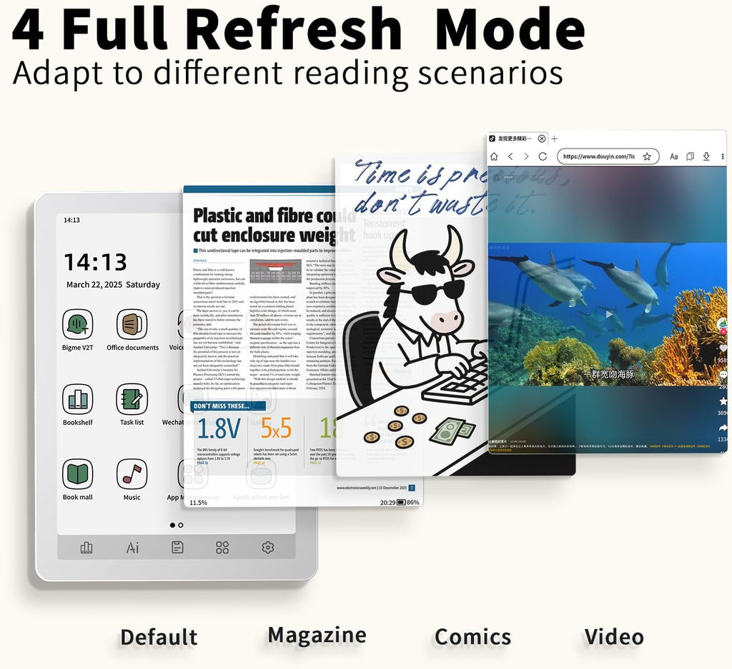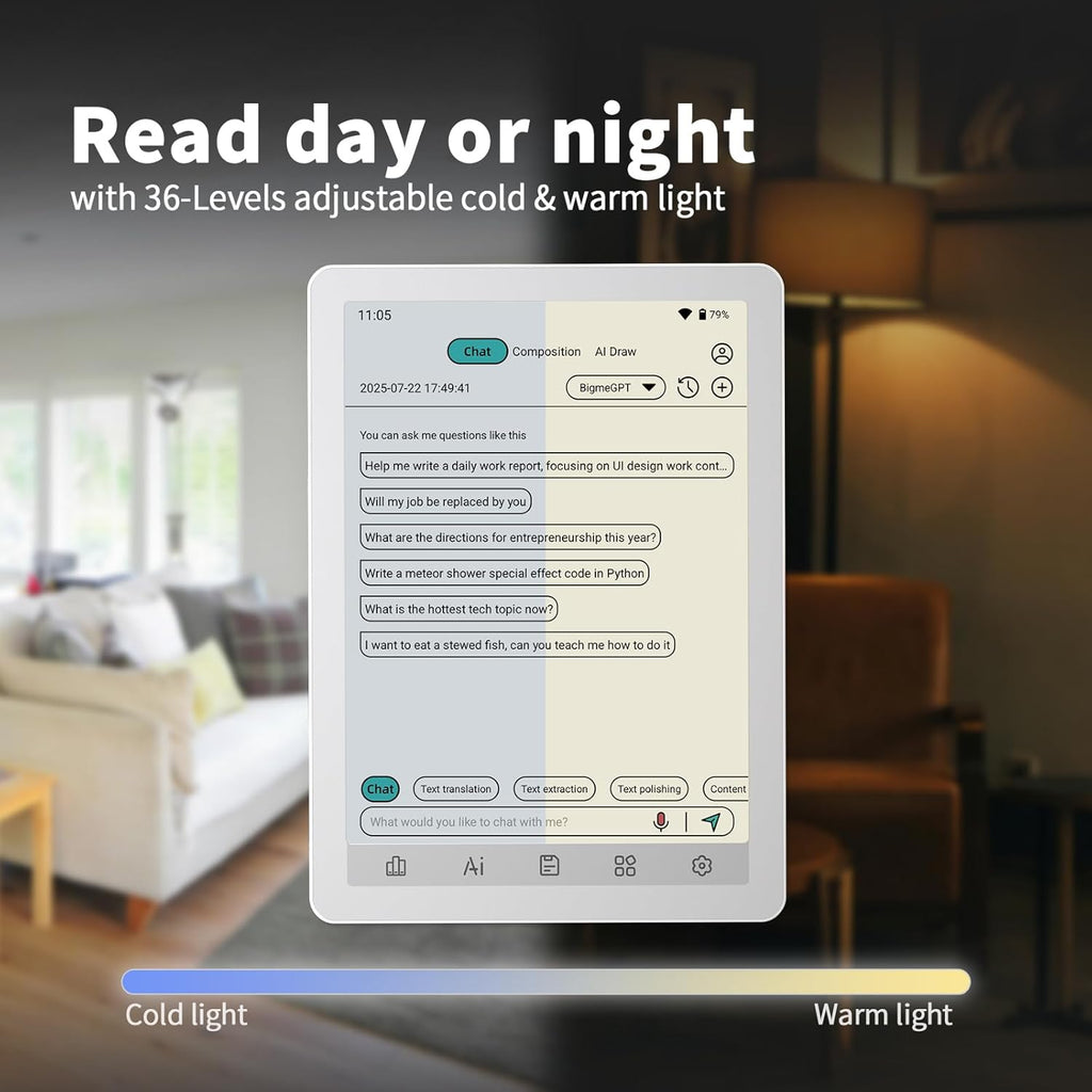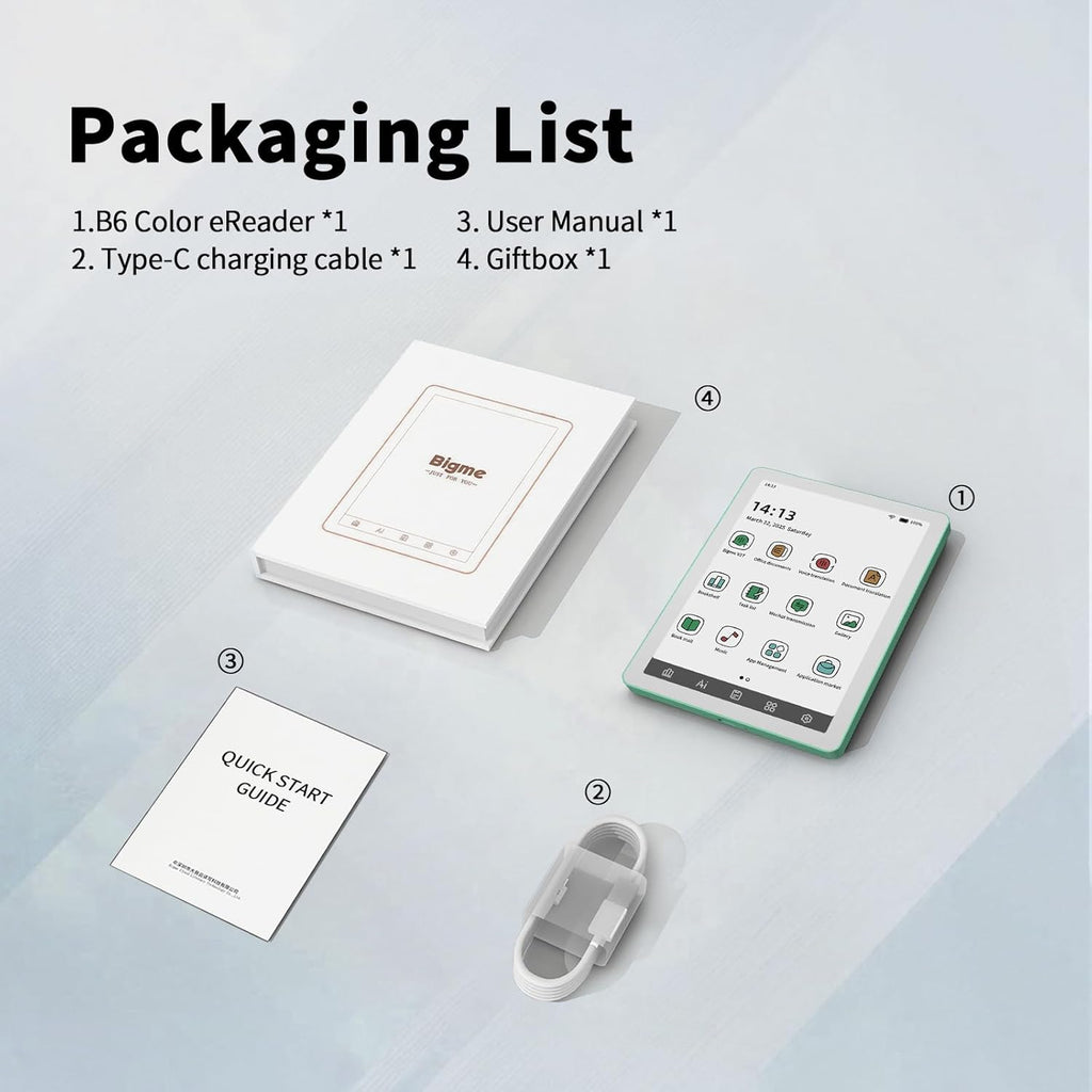 El Bigme B6 Color redefine la lectura portátil. Con un cuerpo ultra delgado de solo 6.98mm y sistema Android 14, este E-Reader te ofrece la libertad de una tablet con la comodidad visual del papel. Disfruta de textos nítidos y gráficos vibrantes dondequiera que vayas.