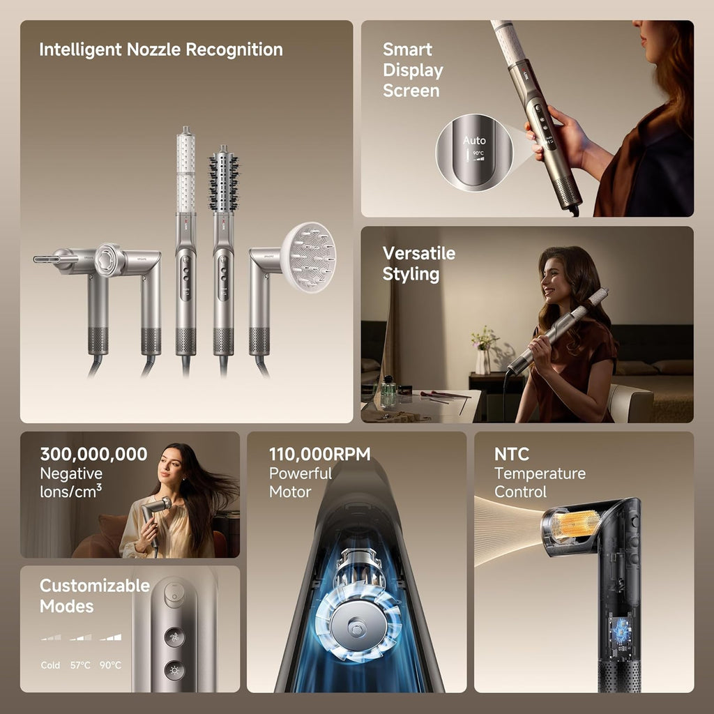 Descubre el equilibrio perfecto entre potencia y cuidado con este estilizador y secadora de cabello de última generación. Dreame Dazzle ofrece una experiencia de lujo y resultados profesionales que rivalizan con la calidad de Dyson, combinando un motor de 110,000 RPM y tecnología de iones negativos para proteger cada hebra de tu cabello.