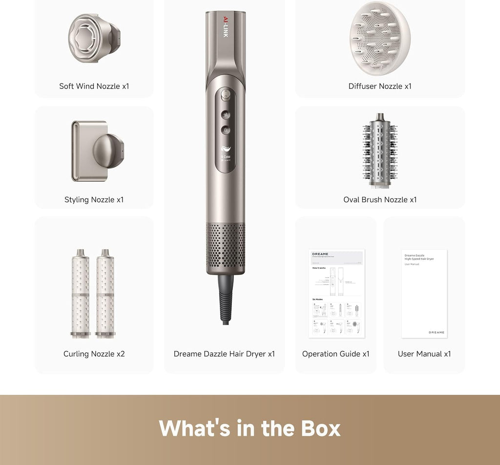 Contenido de la caja: Unidad principal Dreame Dazzle (Estilizador y Secadora), 5 boquillas de estilizado, manual de usuario.
