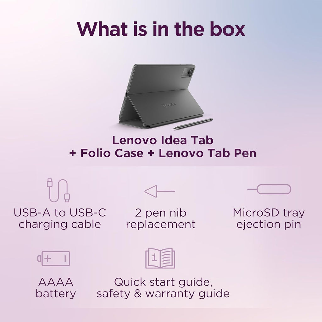 Protege tu trabajo con la **funda Folio Case** incluida. Su soporte versátil te permite dibujar, tomar notas o ver tu streamer favorito cómodamente en cualquier lugar. Además, incluye el **Lenovo Tab Pen** esencial para la toma de notas.