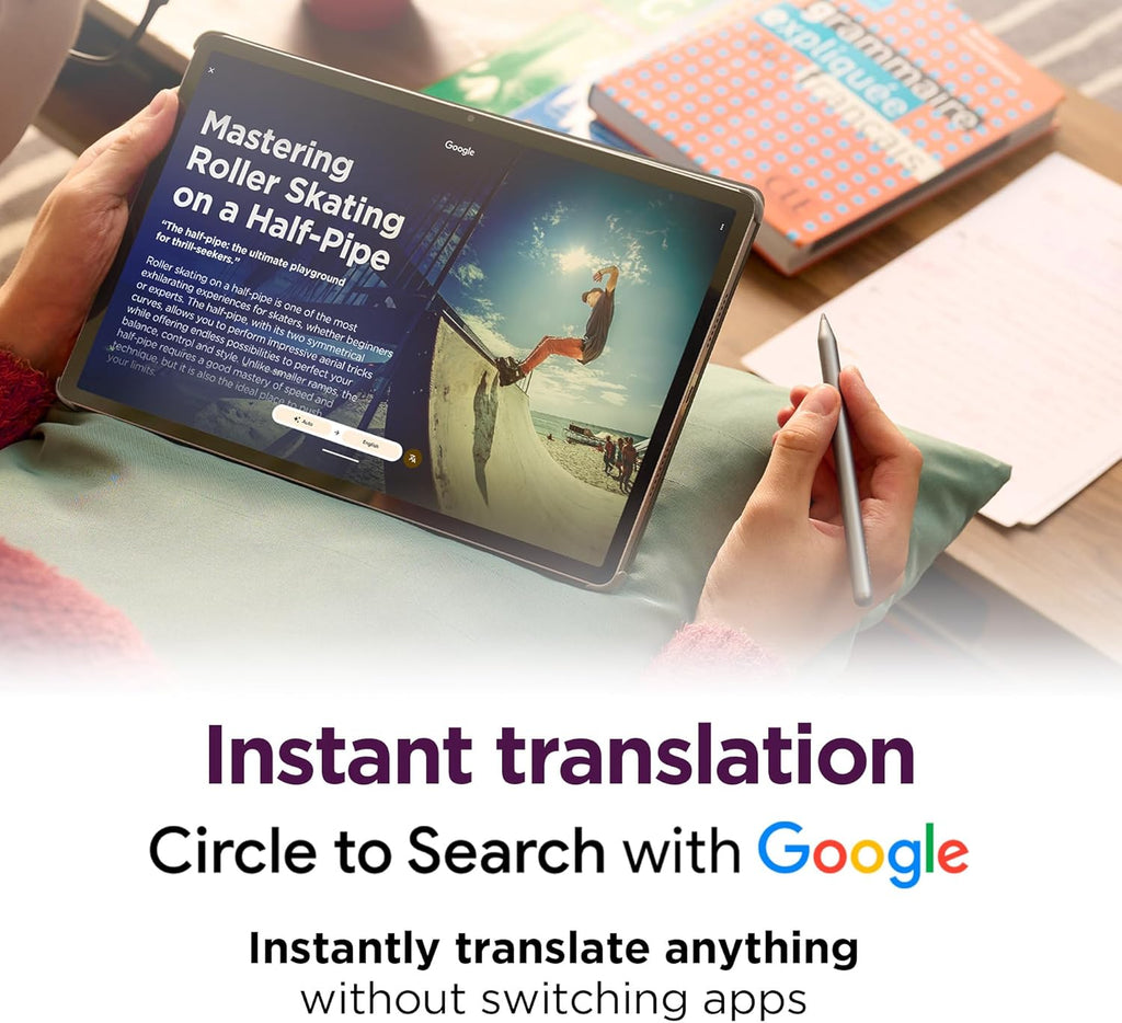 Di adiós a las capturas de pantalla. Presiona el botón de inicio y traza un círculo con tu dedo o el **Tab Pen Plus** (incluido) para obtener respuestas y traducciones instantáneas de cualquier cosa en pantalla.